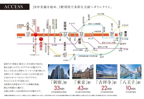 - JR南武線「西国立」駅徒歩7分、JR中央線「立川」駅徒歩20分、多摩都市モノレール「立川南」駅徒歩20分